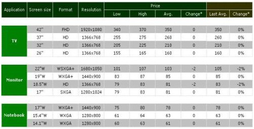 2009年上半年面板價格預(yù)測(單位:美元)