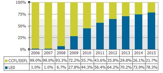 2006-2015采用傳統CCFL&EEFL燈管與LED背光大尺寸液晶面板出貨比率預測