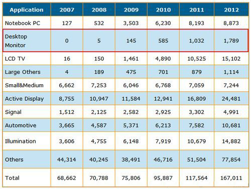 - 2012年估計LED背光將被廣泛地應用在1寸到70寸液晶顯示設備