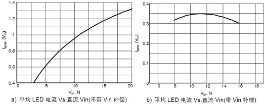圖2:不帶Vin補償及帶Vin補償時的平均LED電流vs. Vin曲線