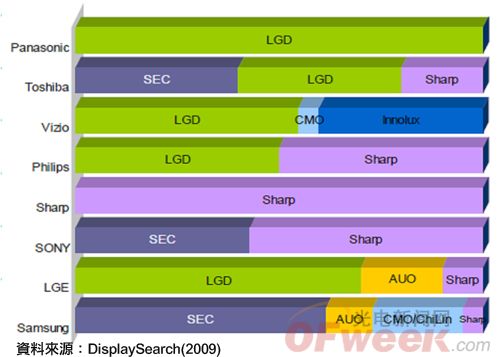DisplaySearch資料顯示,全球前十大液晶電視品牌大廠致力提高2010年的市占率,尤其夏普、飛利浦(Philips)與瑞軒設定的市占目標皆高達50%,有鑒于此,前十大液晶電視品牌大廠已部署好LED TV供應鏈(如圖2),預估至2010年,夏普與LG顯示將是主要的LED面板供應商。