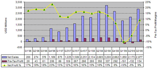 在2009年上半年,生產能力過剩和整個供應鏈的供過于求,造成太陽能發電系統的平均價格降幅達25%以上。然而低價格的刺激,較為容易的融資環境,以及需求的多樣化,加上各個國家及區域新的獎勵政策推出,讓主要的廠商在2009年第三季順利轉虧為盈。