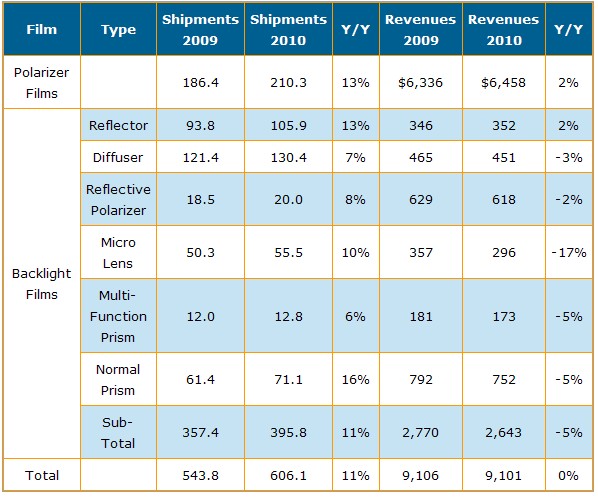 DislaySearch:2010年用于TFT LCD光學(xué)膜面積較去年長(zhǎng)11% 出貨金額基本持平