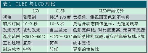 有機(jī)發(fā)光顯示器件之所以受到人們的青睞,是因?yàn)槠渑cLCD為代表的第二代顯示器相比,有著突出的技術(shù)優(yōu)點(diǎn)(見表1):