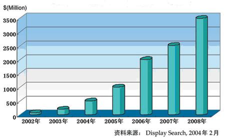 根據(jù)全球權(quán)威平板顯示器(FPD)市場(chǎng)調(diào)研和咨詢機(jī)構(gòu)DisplaySearch在2004年12月的最新統(tǒng)計(jì)(見表2),OLED行業(yè)2004年全年總收入為3.28億美元,比2003年增長(zhǎng)了41%。上圖為DisplaySearch2004年2月對(duì)全球OLED市場(chǎng)的預(yù)測(cè)。