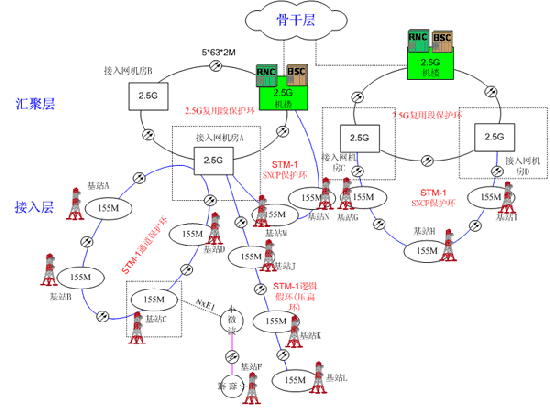 圖1中國移動2G基站回傳所使用的SDH/MSTP技術方案