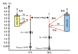 未來,新型鋰離子電池和LED技術將會為LED驅動帶來新的挑戰(zhàn)。配合最新的化學成果,電池電壓的范圍將擴大到2.3~4.7V,而典型的白光LED正向電壓將會下降至2.9V。與此同時,輸出驅動器的飽和電壓都會隨著下降。當采用并聯(lián)驅動時,要高效地驅動一個2.9V的LED,就需要動用一個升降壓轉換器。圖2所示為由電池、驅動器和LED技術的進步所帶來的效果。