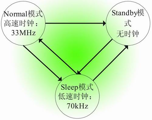電子紙顯示的顯著特點之一是其省電模式,當其顯示一幅畫面后,由于電子紙的特殊技術因素,此幅畫面在無供電或不刷新的情況下可長時間保持。APOLLO芯片驅動部分也同樣具有兩種省電模式:Sleep和Standby,能夠很好的實現低功耗的工作方式。Sleep模式使用低時鐘(70kHz),能夠接收主CPU的指令;Standby模式不使用時鐘,利用主CPU的喚醒信號使APOLLO恢復有效。這兩種模式與Normal模式的轉換如圖5所示。