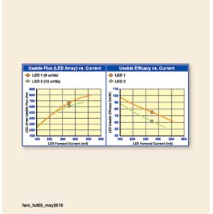 由于LED1的高熱/冷因數(shù),9個(gè)LED1的總光輸出比10個(gè)LED2高出50lm。盡管在25℃時(shí),LED1的額定光通低于LED2,但在350mA的電流驅(qū)動(dòng)下,其性能要超過LED2。圖3(左)顯示了LED1在任何前向電流的驅(qū)動(dòng)下,都比LED2高出100mA。圖3(右)顯示了在同樣的電流驅(qū)動(dòng)下,LED1的效能要高過LED2。