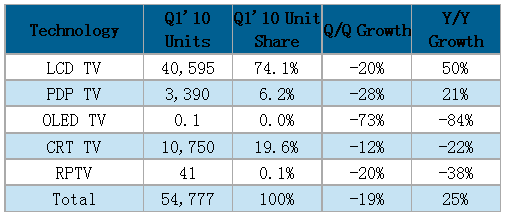 - 2010年第一季所有種類電視機(jī)出貨量較去年同期成長(zhǎng)55%