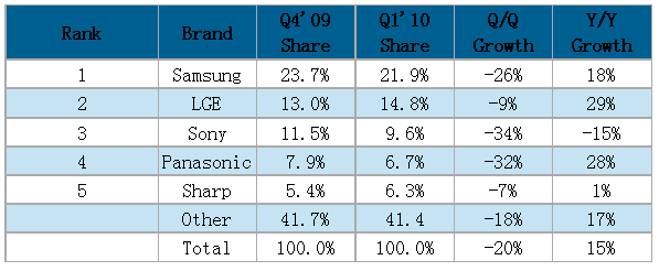 一季度三星電子(Samsung)出貨營(yíng)收比率較去年第四季稍微下滑,不過利潤(rùn)率相對(duì)較其它廠商好,出貨金額比率達(dá)21.9%。同時(shí)三星電子持續(xù)在新技術(shù)如LED與3D電視方面領(lǐng)先其它廠商,這也是該公司持續(xù)良好增長(zhǎng)與較高產(chǎn)品價(jià)格主要原因。以應(yīng)用技術(shù)別來(lái)看,三星電子在LCD TV全球排名第一,在等離子電視則排名第二。