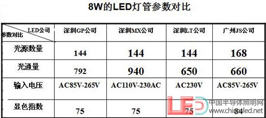 通過(guò)上面的表格可以看出,以上我們?nèi)我膺x擇的四家公司的LED燈管的相關(guān)結(jié)果數(shù)據(jù)有的參數(shù)會(huì)有會(huì)有一定的差別,選用LED光源的數(shù)量從144-168顆,光通量也從650-940LM,相差的范圍有290LM之多,輸入的電壓有寬電壓,也有窄電壓。顯色指數(shù)基本在Ra=75左右,國(guó)家LED燈具標(biāo)準(zhǔn)出臺(tái)后會(huì)有一個(gè)標(biāo)準(zhǔn)和規(guī)范。以上為各廠家自行測(cè)試結(jié)果(如上圖所示)