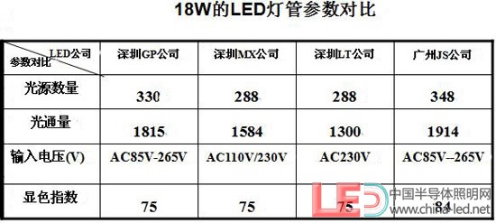通過(guò)上面的表格可以看出,以上我們?nèi)我膺x擇的四家公司的LED燈管的相關(guān)結(jié)果數(shù)據(jù)有的參數(shù)會(huì)有會(huì)有很大的差別,選用LED光源的數(shù)量從288-348顆,光通量也從1300-1914LM,相差的范圍有614LM之多,輸入的電壓有寬電壓,也有窄電壓。顯色指數(shù)基本在Ra=75左右,國(guó)家LED燈具標(biāo)準(zhǔn)出臺(tái)后會(huì)有一個(gè)標(biāo)準(zhǔn)和規(guī)范。以上為各廠家自行測(cè)試結(jié)果(如上圖所示)