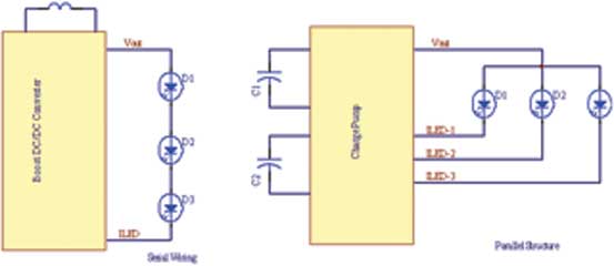 就這點而言,我們可以考慮采用串聯(lián)或并聯(lián)方式對LED進行連接:這兩種連接方式各有其優(yōu)缺點,見圖2。
