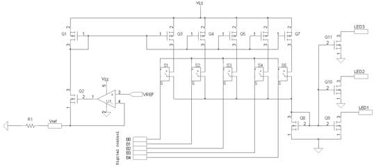 為了在LED中實現精確及穩(wěn)定的正向偏置條件,通過與帶隙參考提供的恒定電壓相關的外部電阻產生一個參考電流。與運算放大器U1相關的晶體管Q1在Vref引腳產生恒定輸出電壓。Vref和地之間連接的外部電阻產生流經Q1和Q2的恒定電流。這個電流這時候就被Q3~Q7的晶體管系列建立鏡像和放大,每個電流被連接至開關S1~S5,并且被晶體管Q8相加。最后,晶體管Q9復制參考電流至LED1。這種結構針對每個LED進行復制,而芯片的布局經仔細分析,以優(yōu)化每個LED之間的匹配。