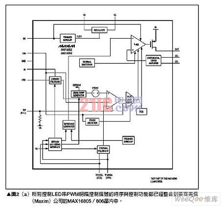 對于需要高照明功率,例如照明燈或霧燈等應用就必須使用多個高亮度LED(HighBrightLED;HBLED),但是高亮度LED卻需要超高驅動電流,要產生所需的電流會使用太多的驅動芯片,因此較簡單的解決方案是使用可以推動高電流晶體管的控制器,為高亮度LED提供高達30A的電流,這類組件的一個范例為MAX16818,請參考圖5。