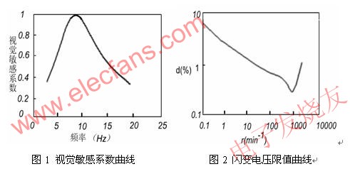可以被人眼感知的光源閃爍,可以通過統計的方法來測得人眼的對光源閃爍的感覺特性。圖1是人眼對不同頻率的電壓波動引起的視覺敏感系數曲線。從曲線上可以看出最敏感的頻率是8.8Hz,偏離該頻率后,敏感度隨頻率而降低。當閃爍頻率40Hz以上時,感覺就不靈敏;50Hz以上的閃爍就完全沒有感覺。