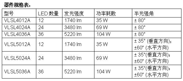 每個模塊皆配有12、24或36個高亮度LED,VLSL40xxA采用VLSL-REFL01反射鏡調整發光特性,而VLSL50xxA的發光呈蝶型。