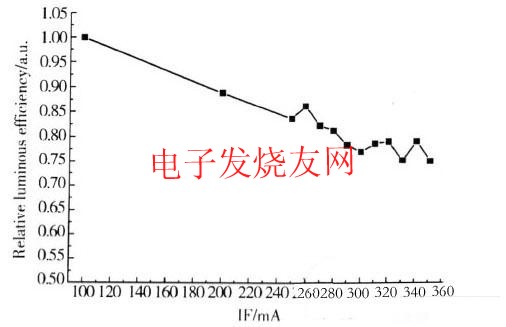 當(dāng)電流增加時,注入發(fā)光區(qū)的電子發(fā)生非輻射復(fù)合的幾率變大,使器件的內(nèi)量子效率降低,同時,由于電流增加導(dǎo)致器件的溫度升高,使熒光粉的量子效率降低并進一步增加了非輻射復(fù)合的幾率。在圖5中,由于驅(qū)動電流在正常的工作電流內(nèi),器件的發(fā)光效率雖有一定的降低,但變化的幅度并不大。