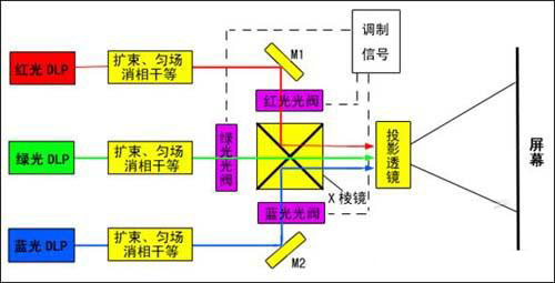 傳統(tǒng)的背投影方案主要是以光源、色輪、圖像引擎芯片、光路、投影的合色、投影物鏡和屏幕的過程組成的。采用激光作為投影光源,可充分發(fā)揮激光光源分色分時(shí)特性,采用光譜合成以及分時(shí)工作的模式,直接應(yīng)用于照明光學(xué)圖像芯片,拋棄過去在光機(jī)中一定使用到的UV、紅外、偏振鏡、復(fù)眼透鏡這樣的一些光學(xué)器件,大幅簡化投影機(jī)光路結(jié)構(gòu)。