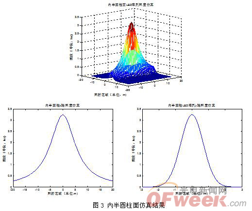比較仿真結果可以得出,平面分布陣列的光照面積小、光輸出集中、發光均勻、光照度高,可以應用于模塊照明、照相制版、化妝鏡燈、聚光(投光)燈等;曲面分布陣列照射面積較大,具有發散的照明效果,可獲得特殊的裝飾照明效果,適用于廣場燈、路燈等。