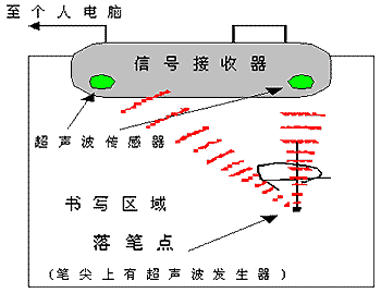 超聲波技術的原理是:利用超聲波的傳輸速度較慢的特性,根據超聲波發射到接收時間計算出發射點到接收點的距離。使用在平面定位上的原理采用的是在屏幕的一邊放置兩個按固定距離分布的超聲接收裝置,用于定位的筆是一個超聲波發射器,當筆移動在屏幕的表面時,所發射的超聲波沿屏幕表面被接收器檢測到,由收到超聲波的時間可以換算出筆與兩個接收器的距離。采用三點定位的原理,即根據三角形已知三個邊長可以確定筆所在的頂點原理,計算出筆所在的位置坐標。是一種測距定位模式。