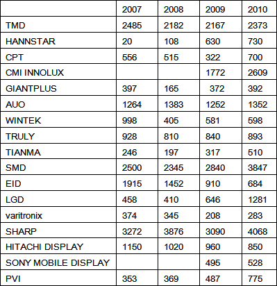 最后,中小顯示屏行業在一年內也經歷了比較大的變動。華映(CPT)和彩晶(HANNSTAR)徹底轉型為中小顯示屏廠家。CPT在2010年出貨量高達3.52億片,比2009年增長135%;HANNSTAR在2010年出貨量高達2.48億片,比2009年增長505%。雖然出貨量大增,但是平均單價不高,毛利低。加上TFT-LCD生產線的高額折舊費用,這兩個廠家還處于虧損的泥潭之中。
