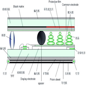 從TFT-LCD的切面結構圖(圖1)可以看到LCD是由二層玻璃基板夾住液晶組成的,形成一個平行板電容器,通過嵌入在下玻璃基板上的TFT對這個電容器和內置的存儲電容充電,維持每幅圖像所需要的電壓直到下一幅畫面更新。液晶的彩色都是透明的必須給LCD襯以白色的背光板上才能將五顏六色表達出來,而要使白色的背光板有反射就需要在四周加上白色燈光。因此在TFT-LCD的底部都組合了燈具,如CCFL或LED。