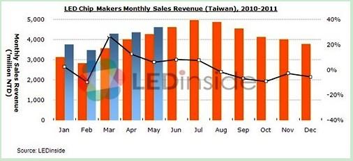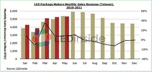 近日消息,據統計,2011年5月臺灣上市上柜 LED 廠商營收總額約新臺幣99.57億元(月成長5.8%、年成長8.3%)。