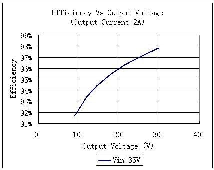 圖中的輸入電壓為35V,輸出電流為2A,當輸出電壓為30V時,效率可以高達97.8%。但是當輸出電壓降低到20V時,效率就降為96%;當輸出電壓降低為10V時,效率就降低為92%。在這三種情況下,盡管其輸出功率依次為60W,40W和20W,但是其損耗功率卻依次為1.2W,1.6W,1.6W。后兩種情況下功耗增大了33%。假如恒流模塊的散熱系統(tǒng)設(shè)計得非常臨界,增加33%的耗散功率就有可能會使芯片的結(jié)溫升高,以致發(fā)生過溫保護而無法工作,嚴重時也有可能使芯片燒毀。