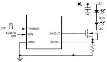 具體實現(xiàn)PWM調(diào)光的方法就是在LED的負載中串入一個MOS開關(guān)管(圖8),這串LED的陽極用一個恒流源供電。