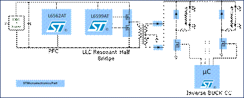 電源電路的最大輸出功率達到130W (48V,2.7A),該電路由兩級電路組成:基于L6562AT的前端功率因數校正器(PFC)和基于L6599AT的LLC諧振轉換器。