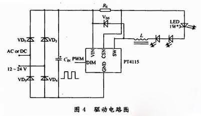 這里采用LED驅動芯片PT4115。PT4115是一款連續電感電流導通模式的降壓恒流源IC,能將直流電壓直接轉換成穩定的恒流輸出。