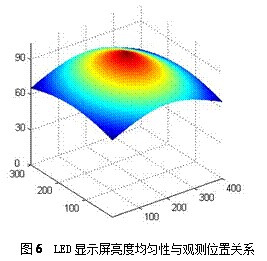 在一定的觀察范圍內,LED顯示屏的相鄰區域的亮度變化大小是由發光強度角分布曲線的斜率決定的。發光強度角分布曲線的曲率大,相鄰區域的LED亮度變化越大;發光強度角分布曲線的曲率小,相鄰區域的LED亮度變化越小。亮度以觀察位置在顯示屏上的投影為圓心,呈同心圓分布,圓心處最亮,亮度隨半徑的增加而減小,亮度變化與發光強度角分布曲線的曲率有關。