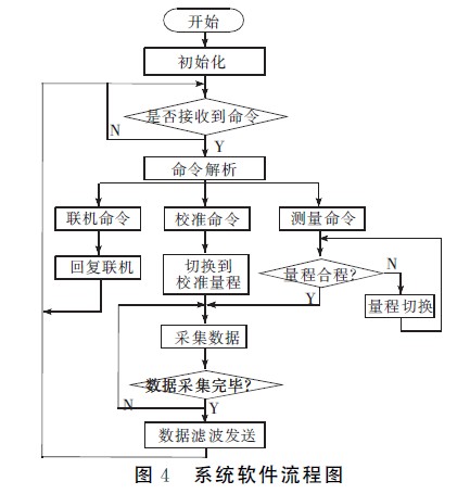 系統(tǒng)軟件采用C語言編寫,在IAR公司提供的集成調(diào)試環(huán)境Workbech下采用模塊化思想進行設計。系統(tǒng)的軟件程序固化在MSP430F149單片機的內(nèi)部Flash存儲器中。系統(tǒng)的程序流程如圖4所示。整個流程可分為初始化、命令解析、數(shù)據(jù)測量、數(shù)據(jù)處理及顯示程序。程序設計借鑒實時操作系統(tǒng)的思想,劃分事件和目標。系統(tǒng)按照工作過程共有命令解析、聯(lián)機、校準、測量判斷、數(shù)據(jù)采集、數(shù)據(jù)打包發(fā)送等幾個事件,通過對事件的處理來完成相應的功能,并進行必要的狀態(tài)轉(zhuǎn)換。當電壓改變后,接收到測量命令,進入測量狀態(tài),將數(shù)據(jù)發(fā)送并顯示,回到空閑狀態(tài)繼續(xù)等待命令然后進行相應的操作。