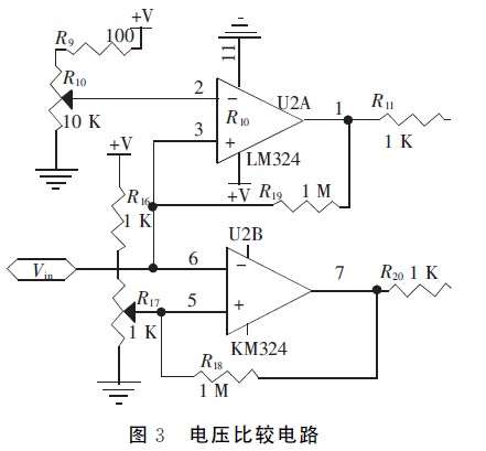 放大后的電壓Vin分別輸入單片機A/D通道和由LM324組成的上下限電壓比較器,根據(jù)比較器輸出分析信號幅度是否在規(guī)定范圍內(nèi)。為了使電路工作更穩(wěn)定,比較電壓值需預留一定的豁量。如圖3所示,調(diào)節(jié)R10使比較上限電壓為2.3V,調(diào)節(jié)R17使比較下限電壓為0.1V,當Vin在0.1~2.3V時,量程合適,比較器輸出邏輯電平00,啟動A/D轉(zhuǎn)換電路。否則,當Vin>2.3V時,通過模擬開關(guān)MAX312并配合軟件來切換I/V轉(zhuǎn)換電路的反饋電阻,向大量程切換;當Vin<0.1V時,向小量程切換,以適應不同強度的光信號。