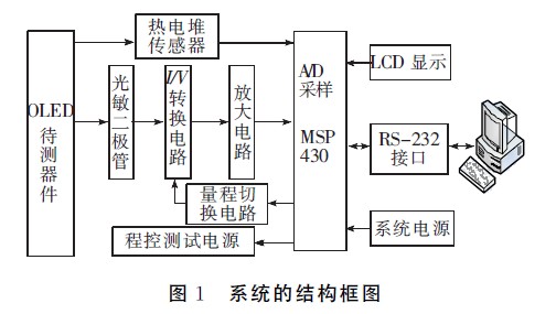針對以上問題,本文設計了一套基于微控制器的OLED光電性能綜合測試系統(tǒng),系統(tǒng)以微控制器為核心,是一個將精密恒壓(恒流)電源、電壓電流測量、溫度測量、亮度測量有機地結(jié)合在一起的測量系統(tǒng),可實現(xiàn)測試條件設置、數(shù)據(jù)存儲、分析、圖形化顯示、打印輸出等功能,實現(xiàn)了對OLED器件光電性能的高精度快速自動測量,使OLED器件的光電性能測試工作變得方便、快捷、科學。