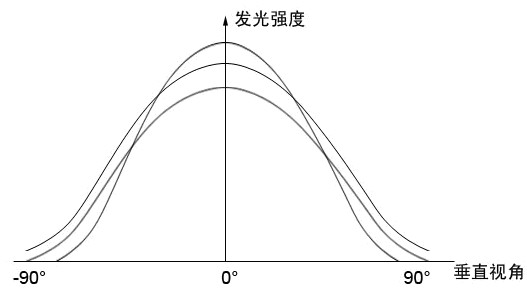 每個燈點在不同的角度觀看時亮度是不同的,且每個燈點隨著角度變化的光強分布曲線也不同。下圖為三顆LED燈點的發光強度隨垂直視角變化的示意圖線: