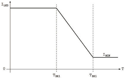 如圖2使用LM3424所示,集成電路將在到達某溫度時返送LED電流,此時,LED電流為零。這與LED作為系統中主要熱發生器的情況不同。對于大燈組件等應用,設計師可能想要設置一項安全功能,即使LED可能在超出安全工作區的條件下工作,也始終能夠提供光輸出。對于此類情況,LED電流與溫度曲線將如圖4中示例所示。雖然LM3424沒有這項內置功能,但這可以使用外部箝位電路輕松實現,并且防止TSENSE針腳上的電壓低于預規定值。