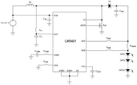 圖1使用LM3421的升壓穩壓器驅動10個LED
