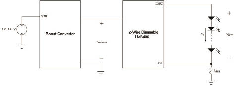 根據具體的設計,上述問題的影響可能可以忽略。但是,如果系統設計師對上述影響存有顧慮,可以采用單個串聯燈組作為首選拓撲結構。在這種解決方法中,仍可以使用LM3406等部件,但將增大系統復雜性,因為需要新前端部件用于傳輸超出12V~14V的電源電壓為LED驅動器供電。然后,LED驅動器降低此新電壓,為單個LED燈組供電。這可以通過在直流電源和LM3406之間增加升壓DC/DC功率級輕松實現,如圖10所示。通過此拓撲結構,串聯燈組中的所有LED均具有相同的電流,無論各LED的VF值是多少。