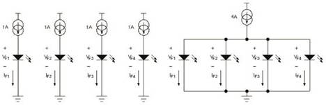 下例顯示了VF變化的影響。在實驗中,使用圖9所示兩種設置收集數據。一種設置用于4個LED,另一種設置用于并聯的4個LED。表1所示數據在25℃加電后5秒內測得,以最大限度降低LED自發熱的影響、