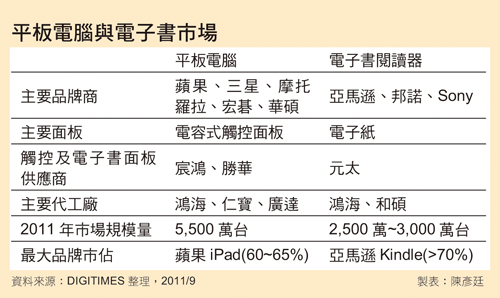 蘋果iPad系列持續在平板計算機市場一枝獨秀,爆發性成長讓各家電信、PC及手機制造廠趨之若鶩,由于平板計算機具備多媒體觸控特性,讓電子書閱讀器業者憂心忡忡,擔心平板計算機大軍崛起恐沖擊電子書市場,然蘋果憑借軟件、成本、價格與規模優勢,陸續讓部分平板計算機業者知難而退,反觀電子書市場穩定成長,供應鏈廠商業績持續翻揚,平板計算機大軍暫難發揮影響力,讓電子書廠商暫時松了一口氣。就目前平板計算機品牌版圖來看,仍以蘋果iPad系列獨占鰲頭,業界預估2011年市占率約60~65%,其次是三星電子(Samsung Electronics),市占率約5~6%,其它各品牌廠市占分別落在1~3%,尤其是2011年初時被業界視為蘋果iPad殺手,未推出產品就先轟動的惠普(HP)、RIM及摩托羅拉(Motorola)等品牌廠,推出前預估出貨量很高,然這些憑借品牌及軟件平臺光芒的先頭部隊卻最先敗陣,讓現存平板計算機業者更加憂心。