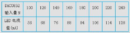 可以看出,隨著DAC0832 輸入的增大,PWM 的占空比越來越大, 對應的LED 電流值也在不斷增大。為了得到它們之間關系, 通過不斷改變程序的方法, 來測試多個DAC0832 的輸入和關鍵點電壓值(考慮到0~100之間為非線性區, 所以從100 開始取值) ,測得的數據如表1 所示。