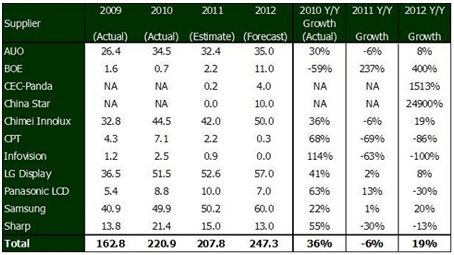 中國大陸的新進面板廠商京東方、華星光電與中電熊貓等也都在2012年隨著其大世代線的量產設下了相當積極的出貨目標;而一些生產較小尺寸液晶電視面板的廠商如華映與龍騰等則會在2012年逐步退出電視面板市場。