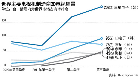 據市場調查機構Display Search 20日公布的《第三季度世界3D電視銷量》顯示,中國有4家企業進入前十,分別是創維(50萬臺,第4位)、海信(49萬臺,第5位)、長虹(34萬臺,第7位)、康佳(27萬臺,第9位)。