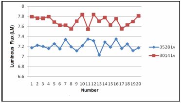 為了保證可對比性,采用相同的物料(相同的芯片、固晶膠、金線、硅膠、熒光粉,)分別對3528 LED及3014LED進(jìn)行封裝,制作色溫、色坐標(biāo)相近的LED燈珠,以便更好的進(jìn)行亮度、光衰及色坐標(biāo)等光學(xué)特性的比較分析。