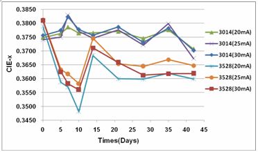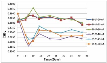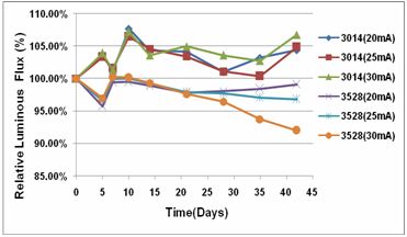 隨機抽取3528LED和3014LED各30pcs,按驅(qū)動電流20mA、25mA、30mA各分為三組進(jìn)行1008H的光衰實驗,以比較分析兩種不同散熱模式LED的光衰和色坐標(biāo)漂移程度,從而研究散熱對其光色特性的影響。