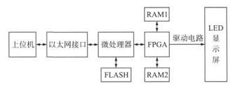 系統(tǒng)采用新一代的32bitRISC處理器STM32作為主控芯片,通過以太網(wǎng)傳輸數(shù)據(jù),以FLASH作為存儲模塊,由FPGA完成對LED顯示屏的高速掃描刷新。系統(tǒng)工作時,利用上位機編輯顯示信息,通過以太網(wǎng)接口將顯示信息傳輸給微處理器,微處理器接收數(shù)據(jù)信息后寫入FLASH存儲器。在顯示時,微處理器讀取FLASH中的數(shù)據(jù),通過總線將數(shù)據(jù)以并行方式發(fā)送給FPGA,FPGA處理后將數(shù)據(jù)傳輸?shù)絃ED顯示屏顯示。