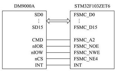 采用以太網(wǎng)接口代替?zhèn)鹘y(tǒng)的串口,加快了數(shù)據(jù)傳輸?shù)乃俣龋瑫r可以實現(xiàn)遠程控制。由于STM32F103ZET6片內(nèi)沒有集成以太網(wǎng)MAC和PHY功能,但其FSMC支持擴展以太網(wǎng)控制芯片,本系統(tǒng)在FSMC上擴展一片DAVICOM公司的DM9000A芯片對STM32F103ZET6進行以太網(wǎng)擴展,DM9000A與STM32F103ZET6的連接如圖3所示。